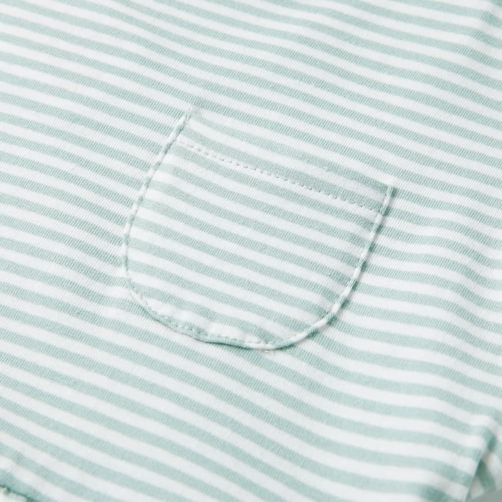Αυτό το παιδικό φόρεμα έχει στρογγυλή λαιμόκοψη, μανίκια με βολάν και μια τσέπη στο στήθος. Αυτό το παιδικό φόρεμα σε χρώμα μέντας έχει ρίγες παντού. Το κοντό παιδικό φόρεμα είναι κατασκευασμένο από μαλακό υλικό που περιλαμβάνει βαμβάκι και ελαστάνη για άνεση και διαπνοή.