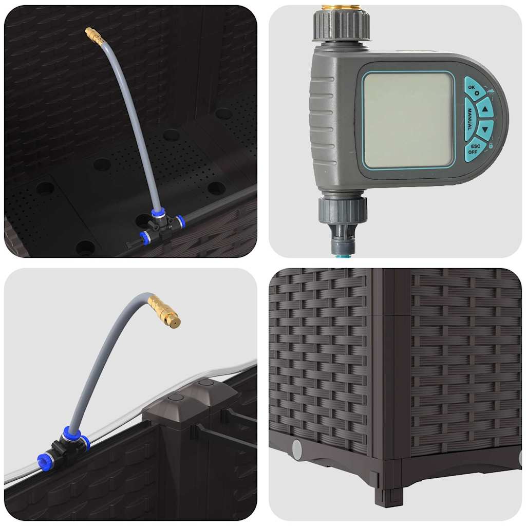 Υλικό Κατασκευής: Η γλάστρα κήπου είναι κατασκευασμένη από ατσάλι ανθεκτικό στις UV, εξασφαλίζοντας αντοχή και αντίσταση σε καιρικές μεταβολές. Αυτή η επιλογή υλικού προσφέρει στιβαρή προστασία, αντέχοντας στην σκληρή έκθεση στον ήλιο και τις εποχιακές αλλαγές, διατηρώντας τα φυτά σας να ανθούν καθόλη τη διάρκεια του χρόνου χωρίς να διακυβεύεται η δομική ακεραιότητα της γλάστρας.,Ενσωματωμένο Σύστημα Άρδευσης: Εξοπλισμένη με ένα προηγμένο σύστημα άρδευσης, αυτή η γλάστρα κήπου απομακρύνει την αβεβαιότητα του ποτίσματος. Χρησιμοποιώντας ενσωματωμένα κανάλια, διανέμει αποτελεσματικά το νερό απευθείας στις ρίζες των φυτών, διασφαλίζοντας ότι λαμβάνουν επαρκή υγρασία ενώ μειώνει την σπατάλη νερού και υποστηρίζει υγιέστερη ανάπτυξη.,Μοντέρνος Σχεδιασμός: Προβάλλοντας ένα κομψό υφαντό σχέδιο, η απλή κομψότητα αυτής της γλάστρας ευθυγραμμίζεται με την σύγχρονη αισθητική. Η μη ανακλαστική ματ φινίρισμα προσθέτει μια εκλεπτυσμένη πινελιά, επιτρέποντάς της να ενσωματωθεί ομαλά σε διάφορες εξωτερικές ρυθμίσεις, ενώ ενσωματώνει τον σύγχρονο στυλ με τις καθαρές, διακριτικές γραμμές της.,Πολυμορφική Χρήση: Ιδανική για τοποθέτηση σε εξωτερικό χώρο, αυτή η γλάστρα εξυπηρετεί τόσο διακοσμητικούς όσο και πρακτικούς σκοπούς. Ο ευρύχωρος εσωτερικός της χώρος φιλοξενεί διάφορα φυτικά είδη, από πλούσιες φτέρες μέχρι ζωντανά λουλούδια, κάνοντάς την κατάλληλη για εποχιακές μεταβάσεις ή για χρήση καθ' όλη τη διάρκεια του έτους, προσφέροντας μια κορυφαία φυτευτική εμπειρία για χόμπι και έμπειρους κηπουρούς.,Φροντίδα & Συντήρηση: Για να διατηρηθεί η άψογη εμφάνισή της, τοποθετήστε αυτή τη γλάστρα σε μια σταθερή τοποθεσία και αποφύγετε την έκθεση σε άμεσο ηλιακό φως για παρατεταμένες περιόδους. Καθαρίζετε τακτικά με ένα στεγνό πανί, διασφαλίζοντας ασφαλείς συνδέσεις κατά τη διάρκεια της συναρμολόγησης για την εγγύηση σταθερότητας και αισθητικής αξίας over time.- Χρώμα: Καφέ