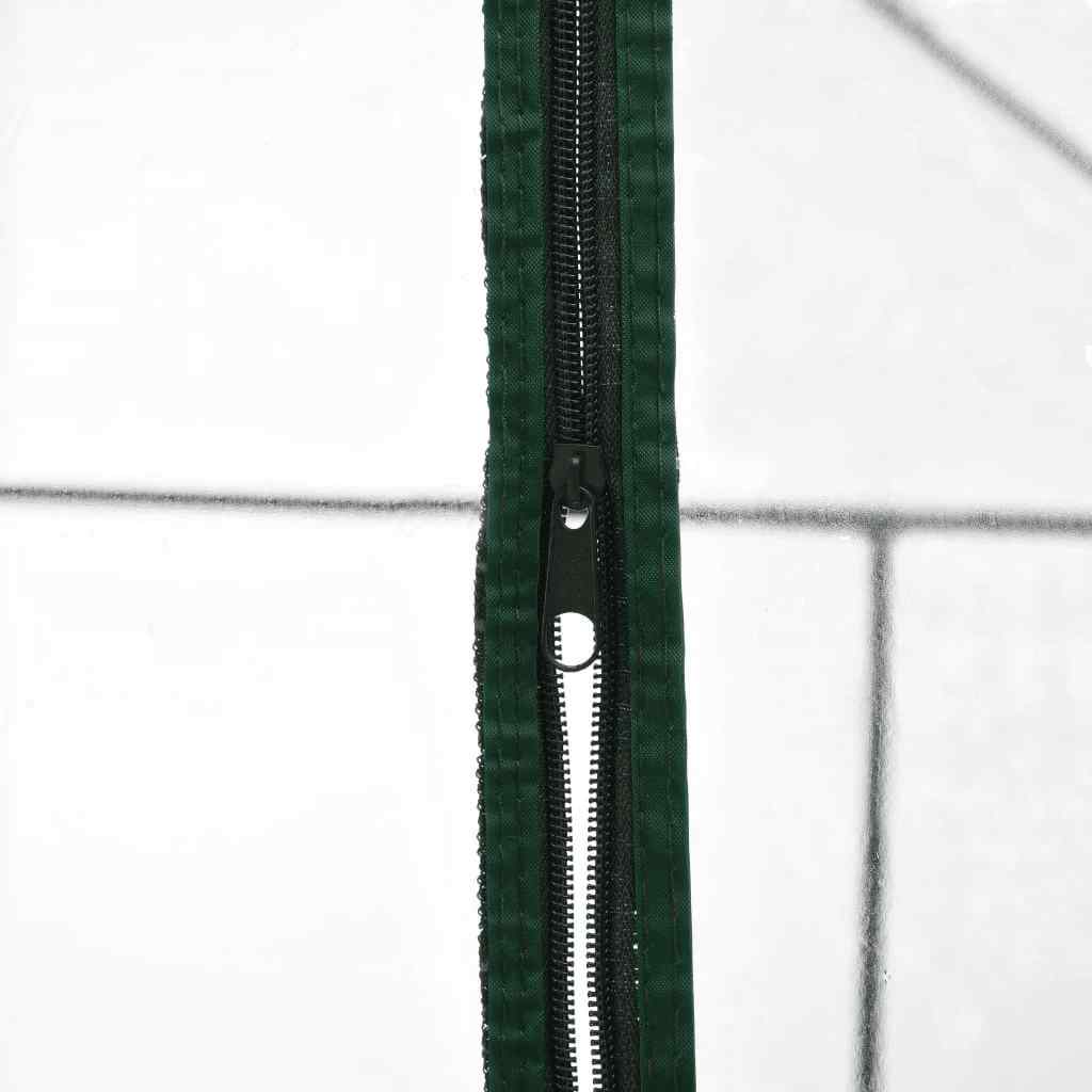 Αυτό το θερμοκήπιο είναι κατασκευασμένο από στιβαρό ατσάλινο σκελετό με αντίσταση στη σκουριά και μεμβράνη από PVC, που εξασφαλίζει υψηλή αντοχή και το καθιστά κατάλληλο για μακροχρόνια χρήση. Κατασκευασμένο με 8 ράφια με σύρμα (4 σε κάθε πλευρά), αυτό το θερμοκήπιο παρέχει άπλετο χώρο για τα αναπτυσσόμενα φυτά σας, τα ανθισμένα λουλούδια, καθώς και για φρέσκα βότανα και λαχανικά. Το διαφανές πλαστικό κάλυμμα επιτρέπει την πρόσβαση του ηλιακού φωτός στα λουλούδια και τα φυτά, ενώ μπορείτε να παρακολουθείτε διαρκώς τα φυτά σας. Είναι σχεδιασμένο με τυλιγόμενη πόρτα με φερμουάρ, εξασφαλίζοντας καλή κυκλοφορία του αέρα και εύκολη πρόσβαση στα φυτά σας.