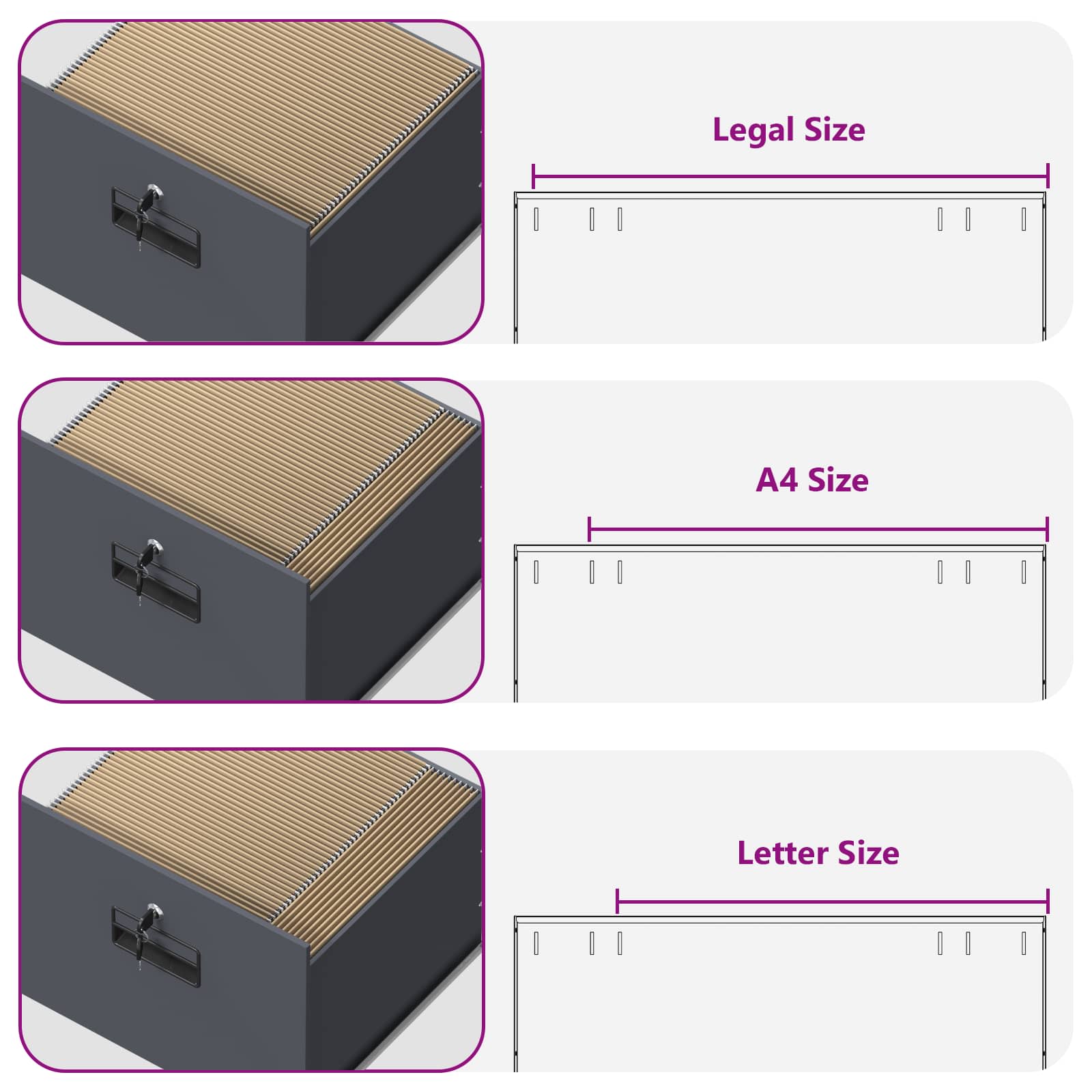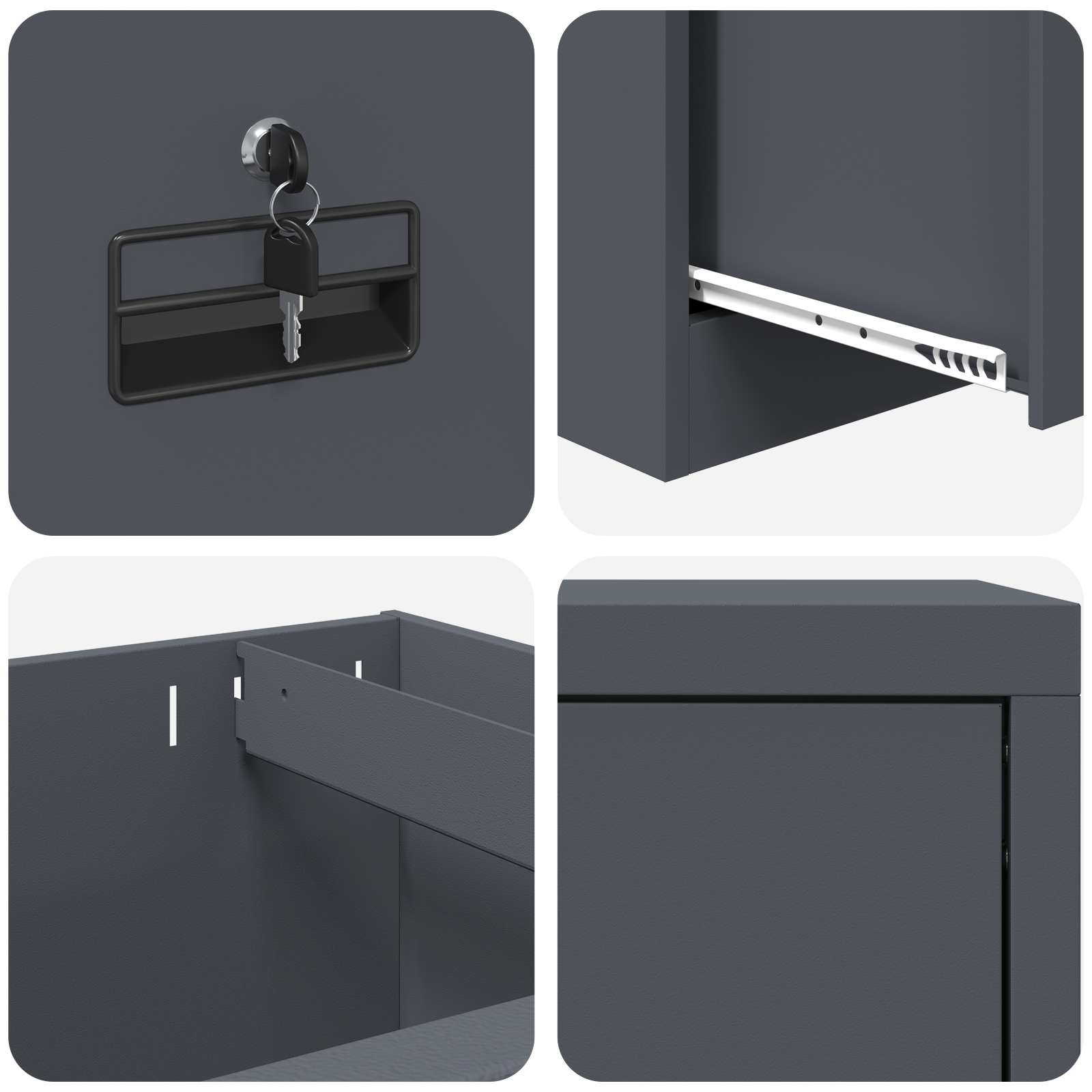 - Υψηλής λειτουργικότητας κλειδώματα Το ντουλάπι διαθέτει κλειδαριές τύπου cam για επιπλέον ασφάλεια. Κάθε κλειδαριά κρατά τα συρτάρια ασφαλή, εξασφαλίζοντας ότι τα περιεχόμενα είναι προστατευμένα από μη εξουσιοδοτημένη πρόσβαση. Είναι ιδανικό για γραφεία με ευαίσθητα ή εμπιστευτικά έγγραφα.