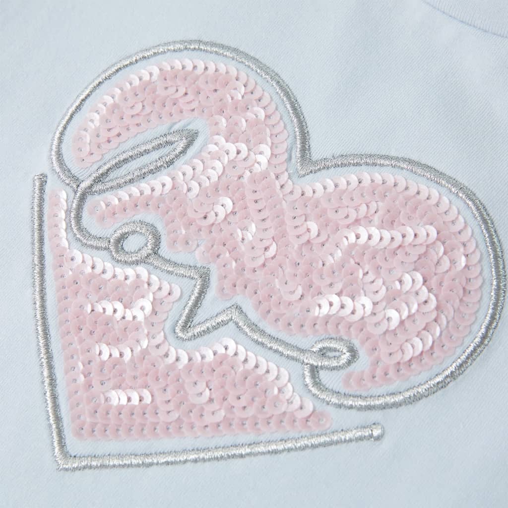 Αυτό το παιδικό μπλουζάκι έχει κοντό μανίκι, στρογγυλή λαιμόκοψη και ίσια εφαρμογή. Αυτό το ανοιχτό μπλε μπλουζάκι έχει μια υπέροχη καρδιά με παγιέτες. Το παιδικό κοντομάνικο μπλουζάκι είναι κατασκευασμένο από 95% βαμβάκι και 5% ελαστάνη για απαλή και άνετη υφή.