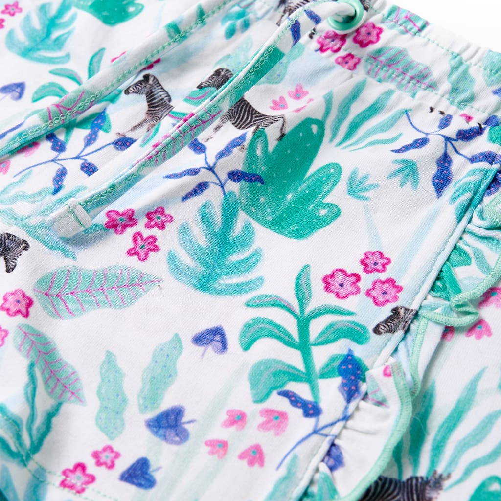 Αυτό το παιδικό σορτσάκι διαθέτει ελαστική ζώνη με κορδόνι, μια τσέπη πίσω και υπέροχα βολάν. Αυτό το παιδικό σορτσάκι έχει τυπωμένες ζέβρες και φυτά σε όλη την επιφάνεια. Το παιδικό σορτσάκι είναι κατασκευασμένο από μαλακό υλικό που περιλαμβάνει 94% βαμβάκι και 6% ελαστάνη για άνεση και διαπνοή.