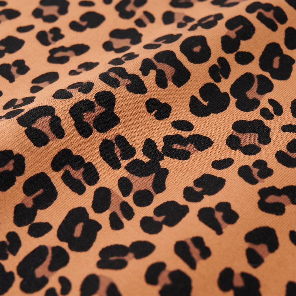 Αυτό το παιδικό φούτερ έχει μακριά μανίκια, σχέδιο λεοπάρ, κυματιστό ζιβάγκο και φαρδιά εφαρμογή. Το παιδικό ρούχο σε χρώμα ανοιχτό κονιάκ διαθέτει κυματιστό στρίφωμα με ελαφρώς τυλιγμένη άκρη. Το παιδικό μπλουζάκι είναι κατασκευασμένο από μαλακό υλικό με 95% βαμβάκι και 5% ελαστάνη, παρέχοντας πρόσθετη άνεση και ζεστασιά.