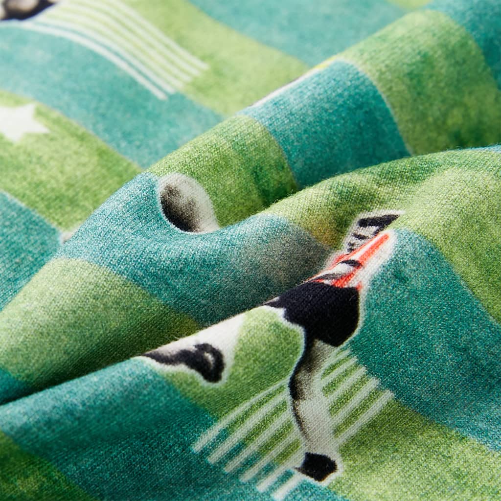 Αυτή η παιδική μπλούζα έχει μακριά μανίκια, στρογγυλή λαιμόκοψη και πλέξη λάστιχο στις μανσέτες, τη λαιμόκοψη και το κάτω μέρος. Το φούτερ είναι κατασκευασμένο από 95% βαμβάκι και 5% ελαστάνη για άνεση και διαπνοή. Η μαλακή επένδυση από φλις προσφέρει επιπλέον ζεστασιά. Το παιδικό φούτερ έχει παντού φιγούρες ποδοσφαιριστή που κλωτσάει μια μπάλα.