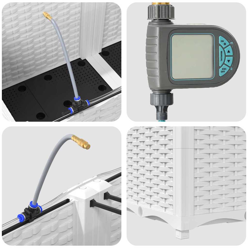 Υλικό Κατασκευής: Η γλάστρα κήπου είναι κατασκευασμένη από ατσάλι ανθεκτικό στις UV, εξασφαλίζοντας αντοχή και αντίσταση σε καιρικές μεταβολές. Αυτή η επιλογή υλικού προσφέρει στιβαρή προστασία, αντέχοντας στην σκληρή έκθεση στον ήλιο και τις εποχιακές αλλαγές, διατηρώντας τα φυτά σας να ανθούν καθόλη τη διάρκεια του χρόνου χωρίς να διακυβεύεται η δομική ακεραιότητα της γλάστρας.,Ενσωματωμένο Σύστημα Άρδευσης: Εξοπλισμένη με ένα προηγμένο σύστημα άρδευσης, αυτή η γλάστρα κήπου απομακρύνει την αβεβαιότητα του ποτίσματος. Χρησιμοποιώντας ενσωματωμένα κανάλια, διανέμει αποτελεσματικά το νερό απευθείας στις ρίζες των φυτών, διασφαλίζοντας ότι λαμβάνουν επαρκή υγρασία ενώ μειώνει την σπατάλη νερού και υποστηρίζει υγιέστερη ανάπτυξη.,Μοντέρνος Σχεδιασμός: Προβάλλοντας ένα κομψό υφαντό σχέδιο, η απλή κομψότητα αυτής της γλάστρας ευθυγραμμίζεται με την σύγχρονη αισθητική. Η μη ανακλαστική ματ φινίρισμα προσθέτει μια εκλεπτυσμένη πινελιά, επιτρέποντάς της να ενσωματωθεί ομαλά σε διάφορες εξωτερικές ρυθμίσεις, ενώ ενσωματώνει τον σύγχρονο στυλ με τις καθαρές, διακριτικές γραμμές της.,Πολυμορφική Χρήση: Ιδανική για τοποθέτηση σε εξωτερικό χώρο, αυτή η γλάστρα εξυπηρετεί τόσο διακοσμητικούς όσο και πρακτικούς σκοπούς. Ο ευρύχωρος εσωτερικός της χώρος φιλοξενεί διάφορα φυτικά είδη, από πλούσιες φτέρες μέχρι ζωντανά λουλούδια, κάνοντάς την κατάλληλη για εποχιακές μεταβάσεις ή για χρήση καθ' όλη τη διάρκεια του έτους, προσφέροντας μια κορυφαία φυτευτική εμπειρία για χόμπι και έμπειρους κηπουρούς.,Φροντίδα & Συντήρηση: Για να διατηρηθεί η άψογη εμφάνισή της, τοποθετήστε αυτή τη γλάστρα σε μια σταθερή τοποθεσία και αποφύγετε την έκθεση σε άμεσο ηλιακό φως για παρατεταμένες περιόδους. Καθαρίζετε τακτικά με ένα στεγνό πανί, διασφαλίζοντας ασφαλείς συνδέσεις κατά τη διάρκεια της συναρμολόγησης για την εγγύηση σταθερότητας και αισθητικής αξίας over time.- Χρώμα: Λευκό
