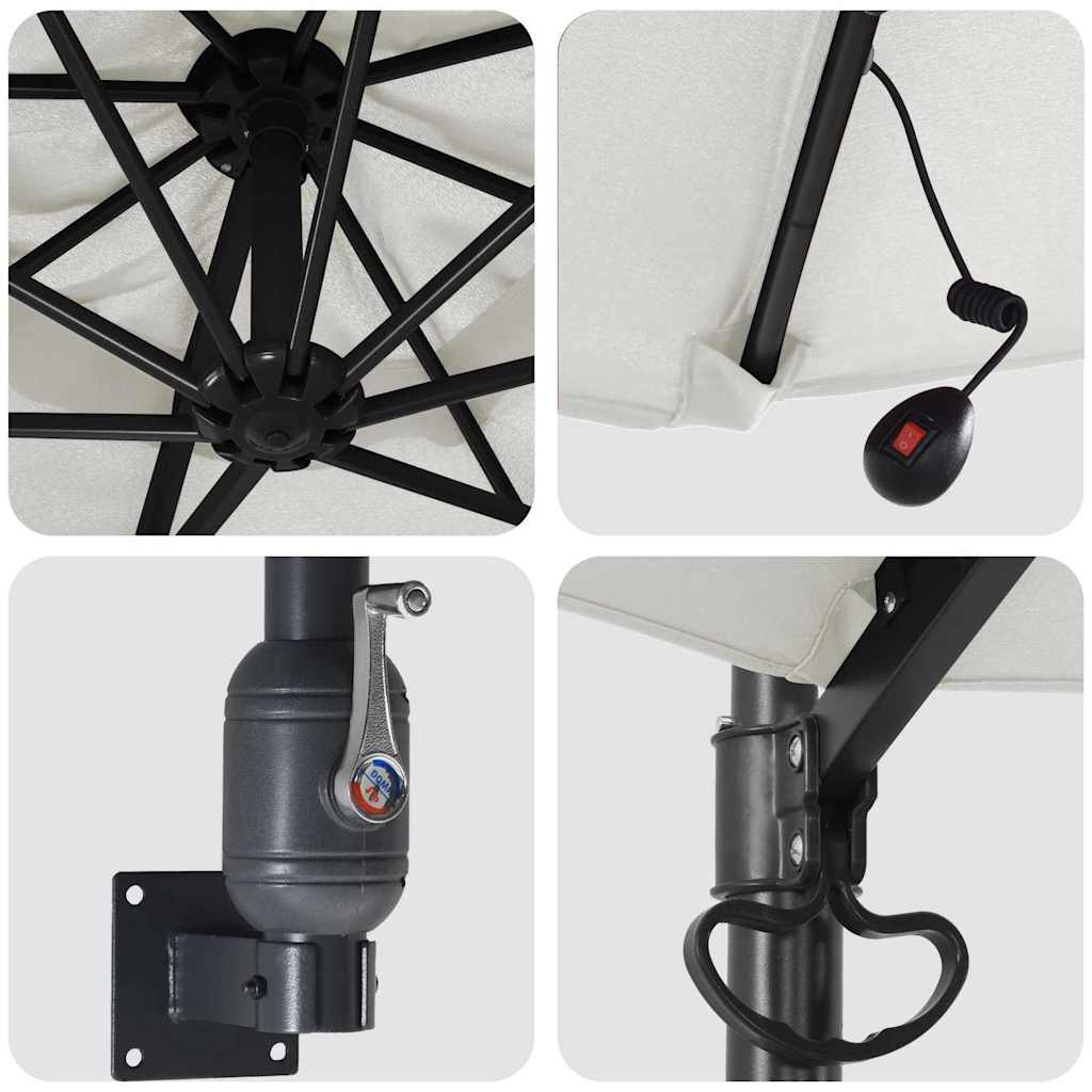 • Φωτισμός LED Εξοπλισμένη με LED κάτω από την επένδυση, η ομπρέλα αναβαθμίζει την ατμόσφαιρα μόλις βραδιάσει. Χάρη στην ηλιακή ενέργεια, σας παρέχει φωτεινά φώτα που δημιουργούν μια ζωντανή εξωτερική ατμόσφαιρα, επιτρέποντάς σας να απολαύσετε τον κήπο σας μέχρι αργά.